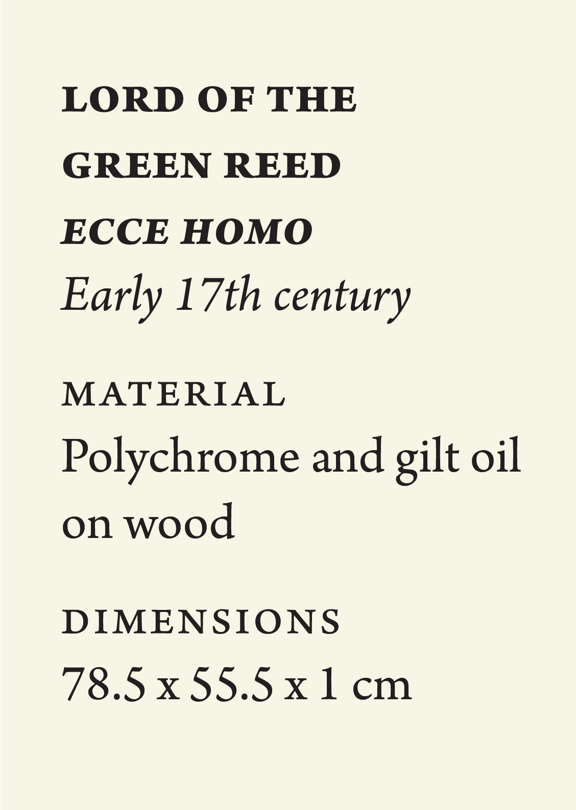 The Ecce Homo (in Latin, ‘Behold the man!’) image developed c. 1400, possibly in Burgundy in France. From the 15th century onwards, Christ was shown alone, as here, his eyes compelling the viewer to share in his suffering. Also called Man of Sorrows or King of the Jews, the theme took on great significance during the Counter-Reformation. It was a common subject in paintings of the Renaissance and Baroque periods, and in Baroque sculpture.